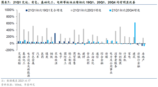 截至2021年4月17日,A股2021年一季报披露1520家(实际已经披露一季报、披露业绩快报、业绩预告),披露率约36%。相比2020Q1,2021Q1归母净利润增速较高的行业包含:交运、有色、纺织服装、煤炭、建材、基础化工、商贸零售、消费者服务、电新等;相比2019Q1,2021Q1归母净利润复合增幅较高的行业为:农牧、电子、交运、军工、轻工制造、基础化工、电新、商贸零售、有色等;相比2020Q4,2021Q1归母净利润增幅较高的行业为:建筑、传媒、基础化工、煤炭、电力及公用事业、食品饮料、交运等。相比19Q1/20Q1/20Q4净利增速均较高(均超30%)的行业为交运、基础化工、有色、煤炭、钢铁、电新、汽车、医药。