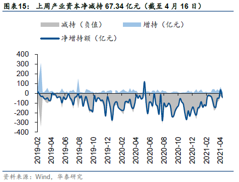 外资方面,上周北向资金净入247.09亿,北向资金主要净流入电子(+48.44亿)、医药(+46.13亿)、非银行金融(+27.69亿)、银行(+18.29亿)、基础化工(+16.47亿),主要净流出电力设备及新能源(-23.37亿)、交通运输(-19.30亿)、煤炭(-0.96亿)、建筑(-0.76亿)、商贸零售(-0.02亿);公募方面,上周新成立偏股型基金53.01亿份,较前一周(114.27亿份)大幅减少;杠杆资金方面,上周两融资金成交占两市总成交比重为7.7%,较前一周下降(8.4%),融资净买入-40.48亿;分行业来看,上周综合金融(+1.25pcts)、非银行金融(+0.87pcts)、建筑(+0.64pcts)、电子(+0.62pcts)融资交易活跃度升幅较高,汽车(-1.41pcts)、食品饮料(-1.09pcts)、交通运输(-1.04pcts)、计算机(-0.97pcts)、综合(-0.67pcts)融资交易活跃度升幅较低;产业资本方面,上周产业资本净减持67.34亿元。