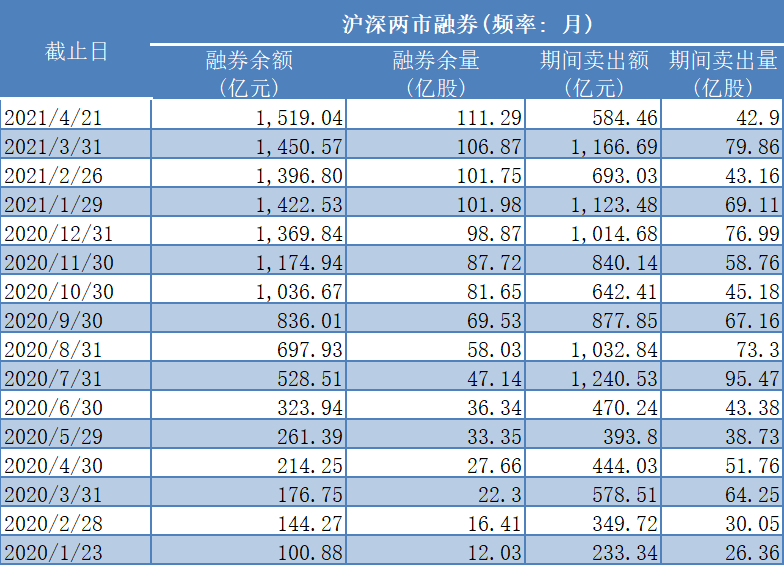 对比2020年和2021年数据:截至2020年4月30日,融券余额214.25亿元,融券余量27.66亿股。而截至2021年4月21日,融券余额1519.04亿元,同比增幅609%,融券余量111.29亿股。