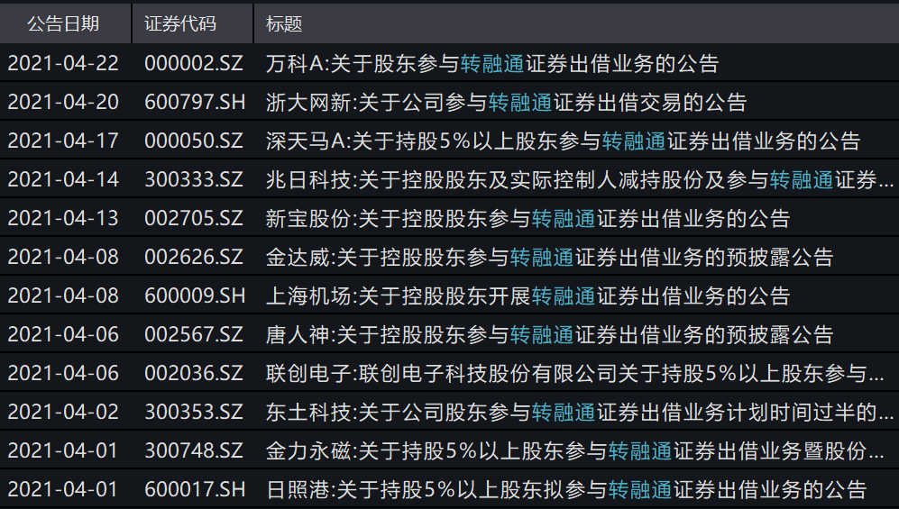 记者据公司公告不完全统计,仅4月份以来,万科A、浙大网新、深天马A、新宝股份、上海机场等多家公司发布了公司(控股)股东参与转融通证券出借业务的公告。