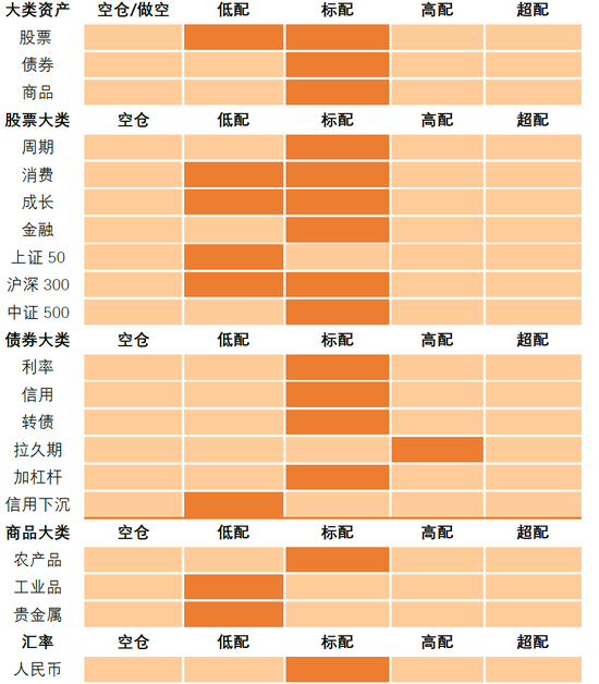 (2)债券:不再继续上调配置仓位,维持利率债【标配】,维持转债【标配】,下调信用债至【标配或低配】(中高等级信用债)