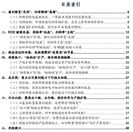 1. 从基金配置看最新业绩趋势,还有哪些“预期差”?2. 出口链制造业有哪些,高景气能否延续?3.上游资源品涨价,对中游制造的传导如何体现?4. 疫后从居家到出行,消费及服务业盈利趋势有何变化?5.制造与科技的产能周期向上,如何衡量供需缺口与扩产有效性?