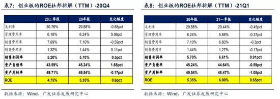 杜邦拆解来看,利润率是创业板ROE的主要拉动力。21Q1创业板利润率回升0.91pct,其中,毛利率回落0.45pct,期间费用率回落加持利润率改善;而周转率和杠杆率则继续回落。