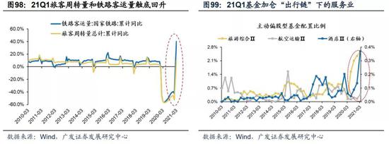 “出行链”及“出口链”下的可选消费及服务业,2021年业绩改善是景气确定性线索之一,基金配置已有体现。基金21Q1加仓的热门领域,旅游、酒店配置大幅上升,航空配置自底部回升。旅游配置上升0.2pct至2.5%,酒店配置上升0.2pct至0.4%,航空运输配置从底部上升0.2pct至0.4%。