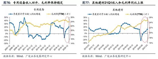 整体来看,涨价带来上游资源行业的毛利率自历史底部连续三个季度抬升。截止21Q1,上游资源品价格上涨对中游毛利的挤压并不明显,但行业存在分化。面对上游资源品价格抬升,中游制造毛利率大多数保持稳健或继续上行(玻璃、其他建材、化学制品、通用机械等),但少数行业确实受到负面影响(水泥、汽车)。