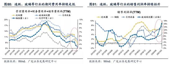 另一方面,从期间费用角度,压降三费率,缓解毛利向净利的传导压力,销售利润率实现持续提升,如造纸、玻璃、专用设备、化纤等行业。其中,玻璃制造期间费用降低带来的销售利润率改善最为显著,从20Q2的7.1%上升至21Q1的16.2%,支撑其ROE(TTM)自疫情以来持续上升。