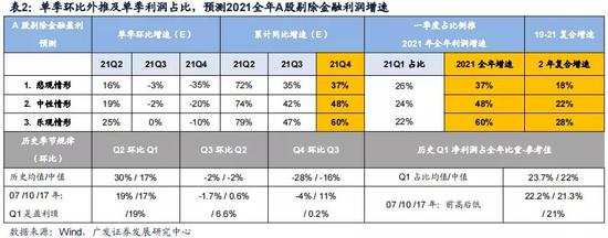 结合金融板块的盈利预测,我们预测A股整体21年全年的利润增速约为28%。金融板块预计全年增长超过10%。