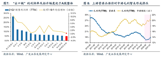 2.上游资源品涨价,对中游制造的传导如何体现?截止21Q1,上游资源品价格上涨对中游毛利的挤压并不明显。疫情带来的行业集中度提升,使中游大多数行业通过下游转嫁、原材料补库、控费、调整产品结构等方式来减少涨价对销售利润率的影响,并保持了ROE的继续抬升(化纤/造纸/玻璃/专用设备)。