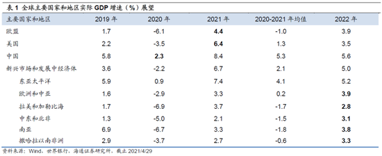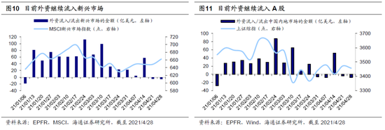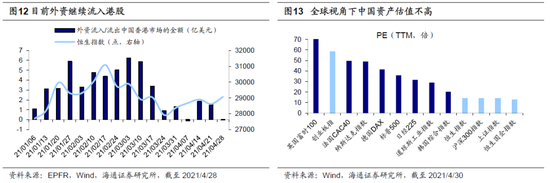 外资继续流入具备优势的中国资产。尽管市场存在缩减QE的预期,但是外资并没有如同2013年一样撤离新兴市场。相反,今年2月以来A股和港股大幅调整,而外资却依然保持净流入的态势。根据EPFR对全球基金资金流的统计,今年年初以来(截至2021/4/28)外资合计流入新兴市场781.1亿美元,其中超过一半的资金流入A股市场(397.7亿美元);同时,外资流入港股市场51.5亿美元。另外,港交所统计口径下,今年年初以来(截至2021/4/30)北向资金合计流入A股1525.0亿人民币。外资主要流向中国资产的原因在于中国疫情防控最好、经济恢复更快,根据世界银行预测,2021年新兴市场经济体实际GDP增速为6.7%,主要是因为中国经济增速较快(8.4%),其他新兴市场国家经济复苏进展较慢。另一方面,对比海外主要市场,中国资产估值不高,截至2021/4/30沪深300 PE(TTM)为14.0倍,上证综指为13.9倍,恒生指数为14.0倍,恒生国企指数为12.8倍,均低于其他主要指数;而中国资产盈利持续向好,截至2021/4/30,A股公司均披露了20年年报,港股2000家公司披露了20年年报,占比78%。现有财报数据显示全部A股20年归母净利润同比增速为2.3%,业绩增速较三季度由负转正;港股为-4.8%,降幅收窄。综上,全球视角下,中国资产更具配置价值。