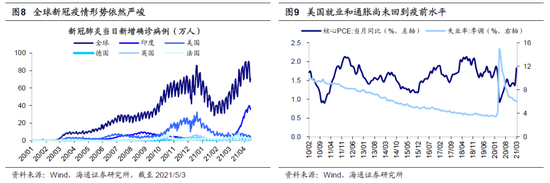 当前美联储缩减QE还为时尚早。在疫苗加速推进和财政政策刺激下,美国经济持续复苏,劳动力市场改善,叠加美债收益率快速上行,市场开始担忧美联储缩减QE。但是,近期全球新冠疫情反复,2021/5/3全球当日新增确诊病例数达到70.9万人,尤其是印度因为防控力度不足导致形势再度恶化,2021/5/3印度当日新增确诊病例数达到35.6万人。而美国国内的通胀和就业水平也尚未回到疫前水平,2021年3月美国核心PCE当月同比为1.83%,依然低于2020年2月的1.87%,2021年3月美国失业率为6.0%,依然高于2020年2月的3.5%,因此美联储短期内尚不具备缩减QE的条件。同时,在以“平均通胀目标制”为核心的货币政策框架下,美联储对通胀的容忍度也有所提高,更加重视就业水平。2021年4月FOMC议息会议纪要显示美联储将保持目前的购债速度不变(每月800亿美元国债+400亿美元MBS),直到在实现最大就业和价格稳定目标方面取得实质性进展。2021/5/4美国财长耶伦在讲话中提到为了保证经济不会过热,利率可能不得不一定程度上升。此消息引发美股盘中大跌,但是随后跌幅收窄。盘后耶伦澄清自己并非在预测或是建议美联储加息,并强调对美联储决策独立性的支持。