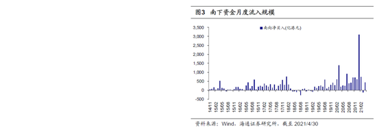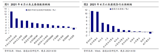 回顾:4月港股震荡上行。4月全球主要市场大部分指数都录得正收益,仅日本市场下跌。恒生指数在4月震荡上行,当月累计涨幅/最大涨幅为1.2%/3.6%。对比其他市场,沪深300指数4月累计涨幅/最大涨幅为1.5%/2.6%,创业板指为12.1%/12.7%,纳斯达克指数为5.4%/7.3%,标普500为5.2%/6.2%,日经225为-1.3%/3.5%,英国富时100为3.8%/4.9%,德国DAX为0.8%/3.3%。从市场走势看,4月恒生指数缓慢上行,4月29日达到当月最高点29303点,4月30日有所回调,月末收报28725点。从行业表现来看,4月港股大部分行业均上涨,仅有地产建筑业(-0.9%)、能源业(-0.2%)下跌,原材料业(11.5%)、医疗保健业(11.1%)4月涨幅较大。4月南下资金流入规模为432.8亿港元,截至4月底南下资金有史以来累计净流入额达21465.5亿港元。2021年4月当月南下资金在港股成交额中占比为11.0%,低于3月当月的14.3%。
