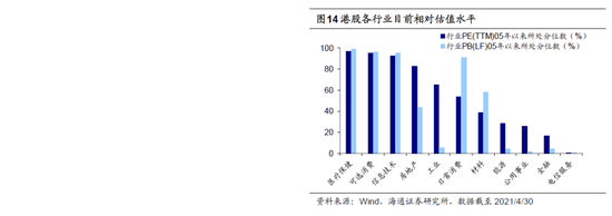 关注科技消费主线机会、低估板块补涨机会。4月份港股震荡上行,目前港股PE(TTM,下同)处于历史中高位但PB(LF,下同)处于历史中低位,相对美股和A股的估值依然较低。截至4月30日港股恒生指数PE为14.0倍、PB为1.3倍,处于2005年以来自下而上73.6%、36.5%分位,而美股标普500PE为35.9倍、PB为4.4倍,处于2005年以来自下而上97.6%、99.6%分位,A股沪深300PE为14.0倍、PB为1.6倍,处于2005年以来自下而上53.8%、40.2%分位。目前AH溢价指数为135.61点,处于2005年以来自下而上的83.7%分位。从投资主线看,我们仍然认为可以关注两类机会:一是关注科技和消费主线。中长期看我国经济正处于转型升级中,科技+消费是转型方向,因此科技和消费的基本面更强,而港股拥有互联网、消费服务等稀缺资产,对内资具有一定的吸引力。二是低估行业轮涨机会。在AH同步上市的公司中,港股金融、地产、周期等价值板块相对A股存在较大的折价,这些低估值板块可能受益于全球经济复苏,AH价差有望收敛。