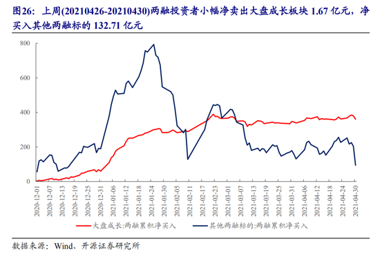 上周(20210426-20210430)两融活跃度继续回升,为3月以来的高点,净卖出134.38亿元,主要净买入医药、食品饮料、煤炭、建筑、有色等板块,主要净卖出计算机、非银、电新、银行、军工、传媒等板块。对于大盘成长板块,两融投资者小幅净卖出大盘成长板块1.67亿元,净卖出其他两融标的132.71亿元。