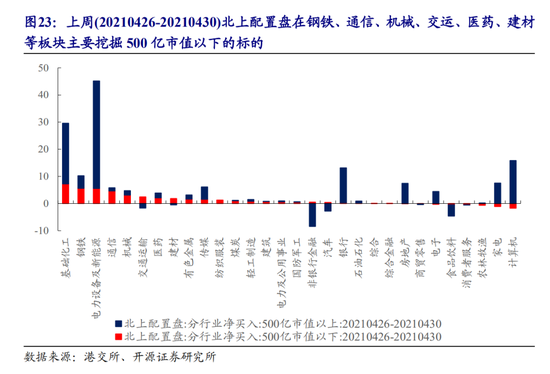 2.4 北上配置盘在钢铁、通信、机械、交运、医药、建材等板块主要挖掘500 亿市值以下的标的