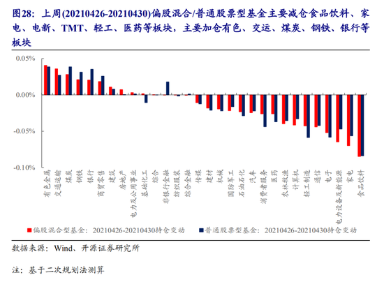 4.1 公募仓位继续下降,主要减仓食品饮料、家电、电新、TMT、轻工制造、医药等板块,主要加仓有色、交运、煤炭、钢铁、银行等板块