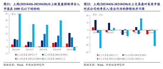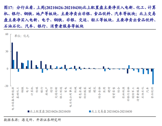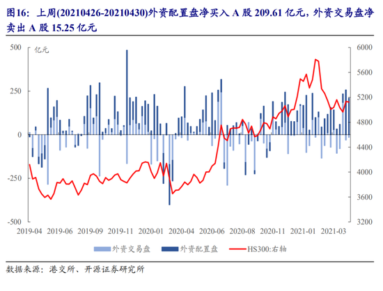 上周(20210426-20210430)外资配置盘净买入A股209.61亿元,外资交易盘净卖出15.25亿元。行业上,北上配置/交易盘的分歧在扩大,两者共识在于买入电新、钢铁、电子、计算机、传媒、公用事业、纺服等行业,同时净卖出食品饮料、汽车、消费者服务等行业。对于大盘成长板块,北上配置盘净买入,交易盘净卖出,但两者均主要挖掘大盘成长以外的标的。对于白酒板块,外资配置盘卖出白酒板块(3.69亿元),其中净卖出贵州茅台1.93亿元。分市值看,上周配置盘在钢铁、通信、机械、交运、医药、建材等板块主要挖掘500亿市值以下的标的。