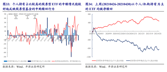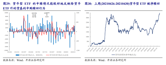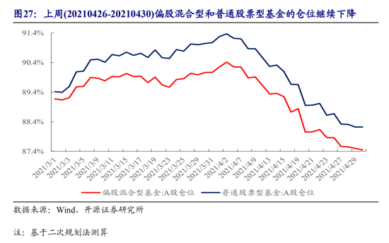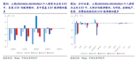 上周(20210426-20210430)偏股混合/普通股票型基金的仓位继续下降,主要减仓食品饮料、家电、电新、TMT、轻工、医药等板块,主要加仓有色、交运、煤炭、钢铁、银行等板块。上周货币ETF被净赎回,这意味着货基整体可能被净赎回,同时近期7天理财预期收益率相对于货基上行,且以个人持有为主的股票型ETF被净赎回,这意味着理财可能吸纳了来自货基和偏股基金的赎回资金。面对市场的震荡,个人投资者选择赎回,且在反弹时赎回较多,市场“负反馈”继续进行中。分行业看,以个人持有为主的ETF中,与科技、金融地产、医药、消费、新能源汽车等板块相关的ETF被净赎回较多。结合主动基金来看:公募与其负债端(个人)的共识在于卖出科技、医药、消费、新能源汽车板块,而在金融地产板块存在较大分歧。结合北上配置盘来看:公募与其主要对手盘(北上)共识在于买入有色、交运、煤炭、钢铁、银行等板块。对于趋势交易者而言,两融表达了对上述共识中的煤炭、有色板块的认可,而北上交易盘并未表达对上述任何板块的认可。这意味着当下以钢铁、煤炭、有色为代表的传统行业和低估值的银行板块可能正在逐步被基本面选手认可,而趋势交易者对该类资产的分歧仍较大。