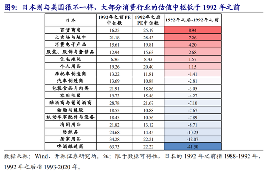 (2)对比美日,美国大部分消费行业的估值中枢在1993年之后反而都要高于1993年之前,而日本很不一样,大部分消费行业的估值中枢低于1992年之前。我们认为造成上述分化的背后其实有两方面的原因:一方面很重要的原因是日本的老龄化速度远高于美国,从美国1942年进入老龄化阶段以来,截至2019年65岁及以上的人口占比仅为16.21%,而日本则是1971年才步入老龄化,但到了2019年其65岁及以上的人口占比就已经达到了28.00%;另一方面是美日在经济增长方面的差距,日本在90年代的资产泡沫破灭之后,经济长期处于停滞的状态,1992-2020年日本的GDP(不变价)年化增长率仅为0.58%,而同期美国为2.34%。