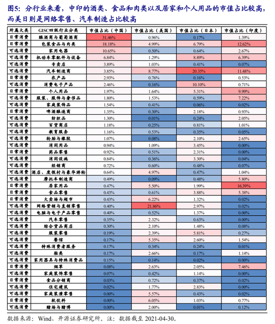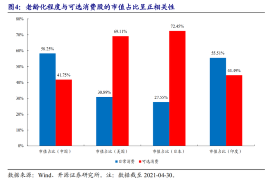 我们以消费股的市值分布来作为观察不同国家之间消费结构的一个代理变量,则从中美日印四国的消费股市值分布来看,老龄化程度与可选消费市值占比呈现正相关关系,即老龄化越严重,可选消费的市值占比越高。为了方便横向比较,我们统一采用GICS的行业分类标准,分别计算中美日印四国的日常消费和可选消费股票的市值在所有消费股中的占比,发现可选消费股的市值占比排序为中国<印度<美国<日本(日常消费则相反),这与老龄化程度的排序基本一致。具体分行业来看,中国日常消费中酿酒商与葡萄酒商、包装食品与肉类市值占比较高,印度主要是居家用品、包装食品与肉类、汽车制造商以及个人用品;而美国的可选消费中网络营销与直销零售、汽车制造商、家庭装潢零售以及酒店、度假村和豪华游轮的占比较高,日本则主要是汽车制造商、消费电子、机动车零配件与设备以及服装零售。