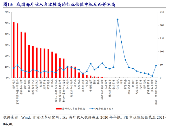 随着我国老龄化程度的加深,一方面消费龙头的海外市场开拓以及海外本土化战略的实施应当成为未来消费股估值的重要参考因素,另一方面非龙头企业在传统消费领域进行的创新尝试尽管具备很大的不确定性,但也应该受到投资者的重视。就目前而言,国内消费行业中海外收入占比较高的为家用电器、消闲用品、服装零售、摩托车制造商以及家庭装饰品等,但上述行业的估值中枢目前还远不如海外收入占比较低的啤酒酿造商、酿酒商与葡萄酒商以及食品零售等行业。