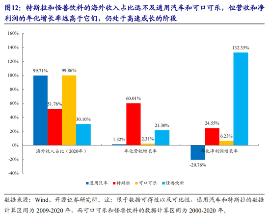 但即便如此,一个行业的龙头,如果其海外市场的开拓也已经达到了最大化,则其估值中枢也会下滑,此时产品的创新与需求的创造将会成为企业新的增长点,典型的如美国的汽车制造商和软饮料行业。以美国为例,汽车制造商中的龙头通用汽车的海外收入占比(2020年年报)已经达到99.71%,而软饮料中的龙头可口可乐已经达到99.86%,这两个公司的年化营收增长率和年化净利润增长率均不高,通用汽车的年化净利润增长率甚至为负(-20.76%)。相比之下新能源汽车的龙头特斯拉以及功能饮料的龙头怪兽饮料海外市场的开拓仍有很大的空间,它们的产品突破了所在行业的传统,开辟了新的市场,创造出新的需求,因此它们的营收和净利润的年化增长率远高于行业“旧龙头”,仍处于高速成长的阶段,估值也更高(截至2021-04-30,特斯拉PE为652.59倍,而通用汽车仅为11.47倍;怪兽饮料的PE为41.83倍,而可口可乐仅为27.21倍)。