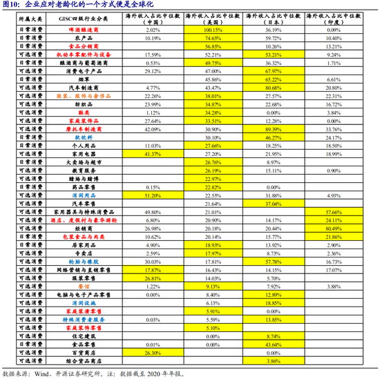 尽管从整体上看中印的消费股估值中枢要比美日要高,但美日还是有部分行业的估值中枢仍处于相对高位,甚至超过中印,而这些行业有一个比较明显的特征是海外收入占比较高,这背后体现的是全球化带来的新的市场需求和成本优势。结合行业的海外收入占比中位数在四个国家中的排名以及估值中位数在四个国家的排名来看,我们发现,美日海外收入占比中位数排名前二的行业其估值的中位数也大多数排名前二:标黄的表示在四国中最大值,红色加粗的行业为美国估值中枢在四个国家中排名前二的行业,蓝色加粗的行业为日本估值中枢在四个国家中排名前二的行业,而橙色加粗为美日估值中枢均在四个国家中排名前二的行业。