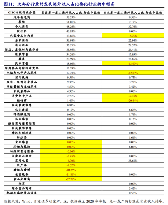 如果从个股的角度来看,往往是行业龙头更易出海开拓海外市场。我们对比了美日各个细分消费行业的龙一龙二(营业收入的维度)与行业的海外收入占比中枢之差,发现绝大部分行业的龙头海外收入占比都要比行业中枢要高,典型的如汽车制造商、餐馆、个人用品和软饮料等行业,这意味着龙头在全球化的过程中大概率是占优的。
