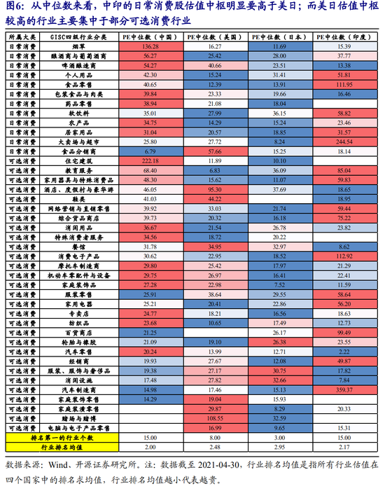 (1)从中位数来看,中印的日常消费股估值中枢明显要高于美日,尤其是酿酒商与葡萄酒商、个人用品、食品零售;而美日估值中枢较高的行业主要集中于部分可选消费行业,比如服装、服饰与奢侈品、消闲设施。从PE中位数在四个国家中排名第一的行业个数以及行业的估值排名均值来看,日本<美国<印度≈中国。