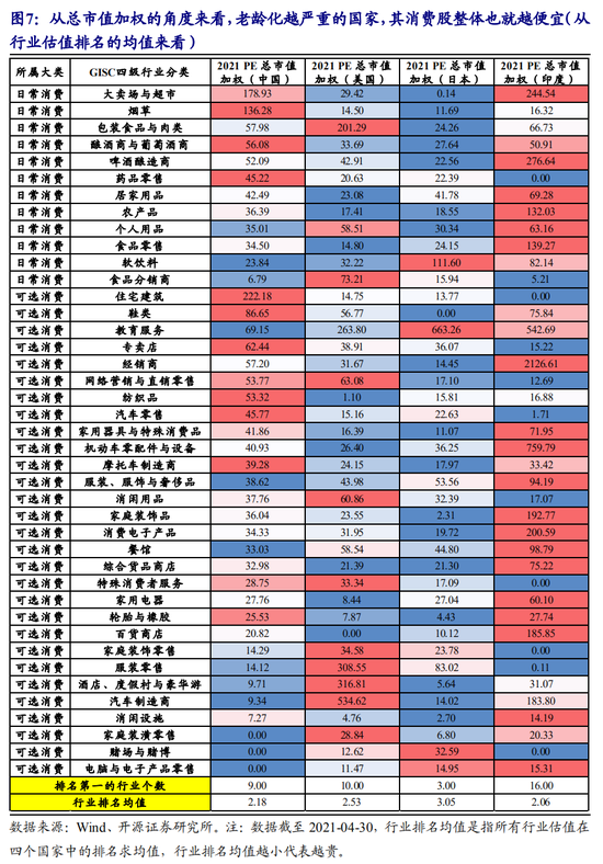 (2)从总市值加权的PE来看,上述规律仍成立,即老龄化越严重的国家其消费股的估值整体也更便宜。主要的区别在于印度和美国在该种算法下其排名第一的行业比中位数要多一些,而中国的要少很多,这意味着在这些行业中龙头股的估值与中小市值的估值差异较大。