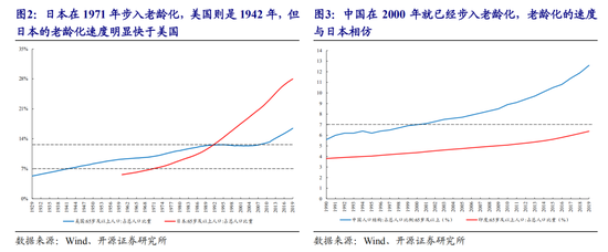 如果从动态的角度来看,我国其实在2000年就已经步入老龄化的阶段,老龄化的速度与日本相仿,明显快于美国。中美日65岁及以上人口的占比达到7%的具体年份分别是2000年、1942年、1971年;2019年中国该比值为12.60%,而美日达到该比值的时间分别是1993年、1992年,分别历时51年、21年,这意味着我国的老龄化速度与日本相仿,而美国则可能由于移民的缘故老龄化速度较为缓慢。