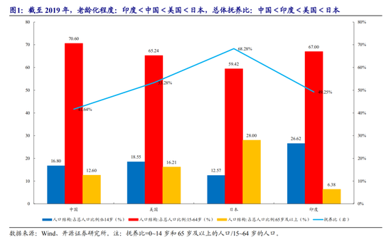 从截至2019年的老龄化程度来看,印度<中国<美国<日本;整体抚养比中国<印度<美国<日本。按照国际上通用的老龄化标准,60岁及以上的人口占比达到10%以上或者65岁及以上的人口占比达到7%以上即为步入老龄化,本文以65岁及以上的人口占比达到7%以上作为判断标准,则截至2019年,中美日印65岁及以上人口的占比分别为12.60%、16.21%、28.00%、6.38%,这意味着老龄化程度印度<中国<美国<日本。从整体抚养比来看,中国<印度<美国<日本,其中印度大于中国的原因在于0~14岁的人口占比较高,因此是少年抚养比较高导致了印度的抚养比比中国还要高。