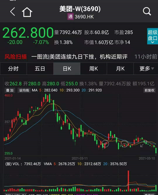 5月10日,美团股价再度重挫7.07%,盘中一度跌9.83%,逼近10%;从2月份460港元高位以来,美团的股价跌了近200港元,跌幅超40%,市值蒸发约1.2万亿港元。