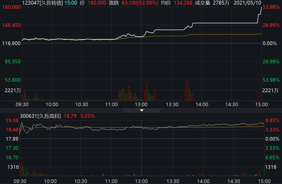 比如,久吾转债收盘涨超50%,其正股久吾高科仅上涨5%。