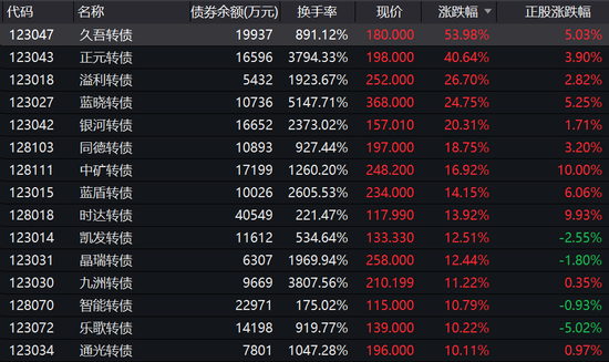 Wind数据显示,10日,涨幅达到10%以上的可转债共计15只,盘中两度熔断的久吾转债、正元转债、溢利转债均高居涨幅榜前列,收盘分别大涨53.98%、40.64%、26.7%。此外,银河转债、同德转债、蓝晓转债分别涨20.31%、18.75%、24.75%。