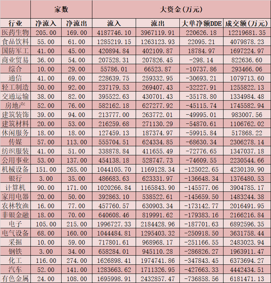 从资金层面看,周四,A股大单资金整体净流出18.41亿元,其中,有1691只个股呈现资金净流入,2494只个股呈现资金净流出。从申万一级的28个行业来看,有3个行业呈现资金净流入态势,其中,医药生物大单资金净流入居首,达到22.06亿元,食品饮料、国防军工等两行业资金净流入分别为2.21亿元、1.88亿元。另外,25个行业均呈现资金净流出态势,其中,有色金属、汽车、化工等行业,资金净流出均超30亿元。