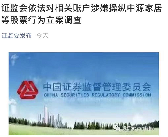 而16日晚间,证监会宣布对操纵中源家居等股票行为立案调查。