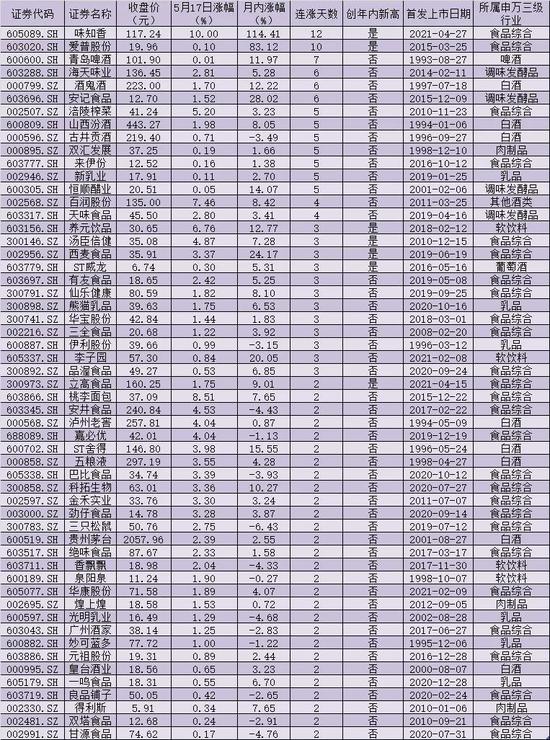截至5月17日,食品饮料行业指数以“五连阳”的状态重返聚光灯下,板块内55只成份股实现连涨,除年内上市新股外,爱普股份、青岛啤酒、海天味业、酒鬼酒、安记食品等5只个股连涨天数均在6天及以上。
