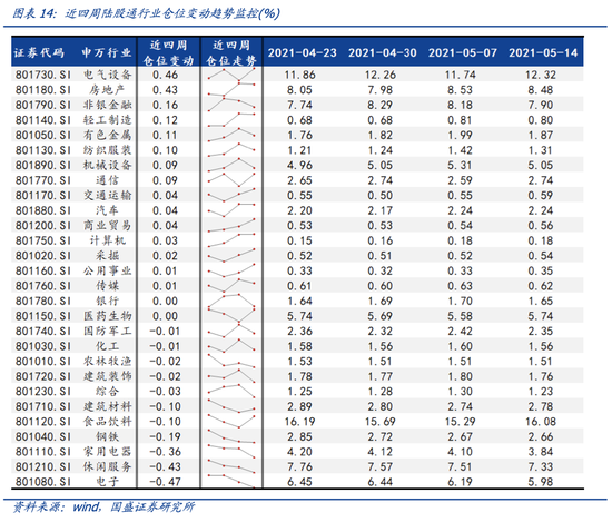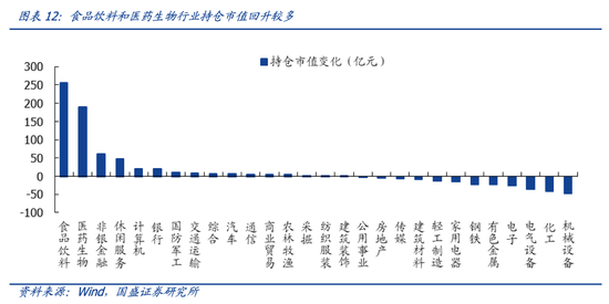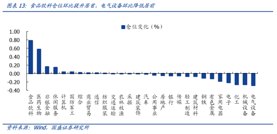 食品饮料仓位提升居首,电气设备仓位回落较多。从持股市值变动角度看,上周食品饮料、医药生物和非银金融行业持股市值大幅提升,分别增加255.62亿元、188.96亿元和62.31亿元;同时机械设备、化工和电气设备行业持股市值回落较多,分别减少48.25亿元、41.75亿元和35.85亿元。从持股仓位变动看,上周食品饮料、医药生物和非银金融行业仓位提升较多,分别提升0.79%、0.58%和0.16%;而电气设备、机械设备和化工行业仓位回落较多,仓位分别下降0.28%、0.26%和0.26%。