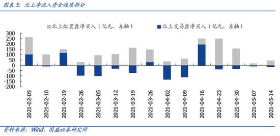 北上流入节奏有所放缓,配置盘持续加仓。上周北上小幅流入27.12亿元,南下资金净流入143.28亿元。根据我们对陆股通资金的拆解和估算,北上配置盘本周净流入规模为41.8亿元,交易盘小幅流出12.53亿元,配置盘和交易盘今年以来累计净流入分别达到1776.84亿元和-152.17亿元。上周主板仓位下降,创业板和科创板仓位上升,截至5月14日,陆股通主板、创业板、科创板持仓比例分别为85.40%、14.43%和0.59%。
