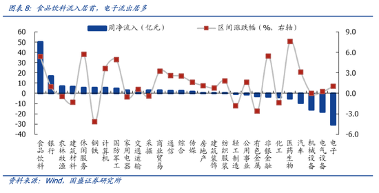 北上集中加仓食品饮料和银行等行业。根据我们的估算,上周食品饮料、银行和农林牧渔行业净流入居前,分别净流入50.3亿元、16.74亿元和7.02亿元;同时电子、电气设备和机械设备行业净流出较多,分别净流出30.72亿元、18.33亿元和16.17亿元。
