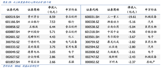 从配置盘角度看,上周配置盘净流入前五大个股依次为:贵州茅台、兴业银行、五粮液、伊利股份、龙蟒佰利,分别净流入8.59亿元、7.53亿元、6.44亿元、5.71亿元、4.43亿元;上周配置盘净流出前五大个股依次为:三一重工、潍柴动力、云南白药、中国平安、韦尔股份,分别净流入19.61亿元、5.16亿元、5.04亿元、4.56亿元、3.67亿元。