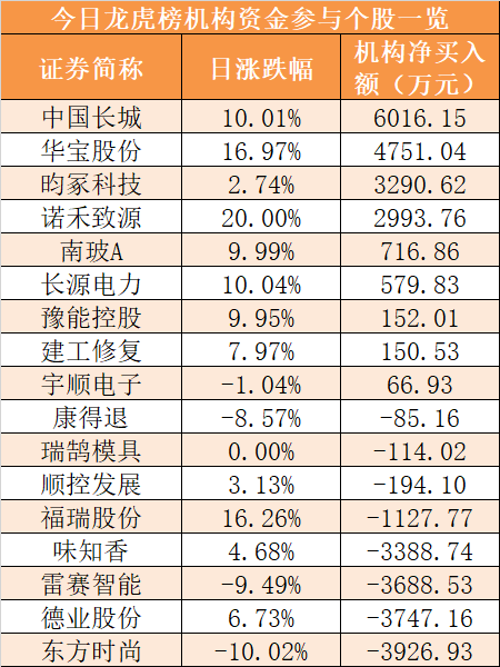 今日盘后公布的龙虎榜数据显示,17只个股出现了机构的身影,机构专用席位净买入0.24亿元。其中中国长城、华宝股份等呈现机构净买入,东方时尚、德业股份等呈现机构净卖出。