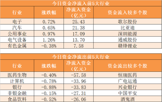 28个申万一级行业中,5个行业实现资金净流入,其中电子行业净流入25.43亿元居首。