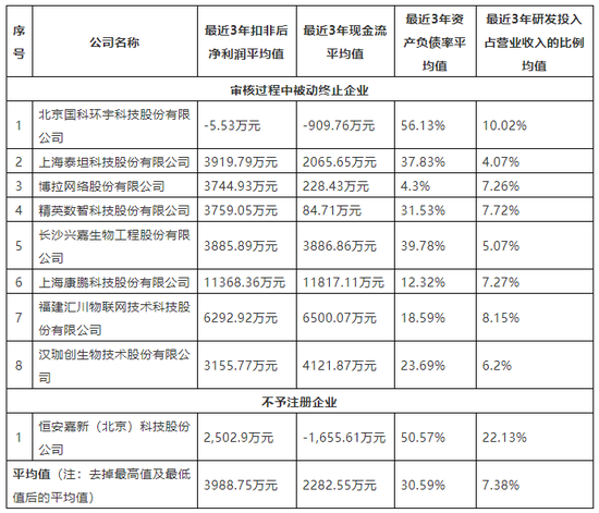 【简析】在传统IPO中,扣非后的净利润一直是企业上市的重要参考指标,有时甚至会将该指标扩大化。上述数据显示,被否企业的最近3年扣非后的净利润均值为3,988.75万元,其实并不低,如上海康鹏科技股份有限公司的净利润均值达到了11,368.36万元。该等数据说明净利润指标并不是发行人上市的唯一指标,注册制下,不会再因净利润一项高而“遮百丑”;前述企业近3年现金流平均值为2,282.55万元,除个别企业外,被否企业还是有一定现金流的;前述被否企业近3年资产负债率均值为30.59%,除个别企业外,被否企业的资产负债率均值在30%左右也是较为常见的,部分被否企业资产负债率较低,如博拉网络股份有限公司,其资产负债率均值仅为4.3%;被否企业最近3年研发投入占营业收入的比例均值为7.38%,高于《科创属性评价指引(试行)》“最近三年研发投入占营业收入比例 5%以上”的硬性标准。