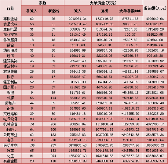 从资金层面看,周四市场呈大单资金净流出态势,为连续第四个交易日净流出,周四DDE大单净额流出达284.27亿元。行业方面,有4类行业呈净流入,分别为:非银金融(275511.63万元)、食品饮料(90501.76万元)、家用电器(72407.86万元)、商业贸易(100.37万元)。