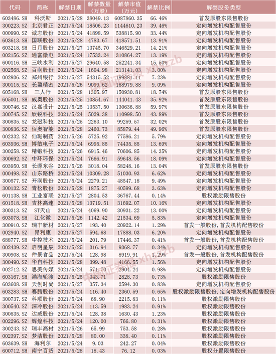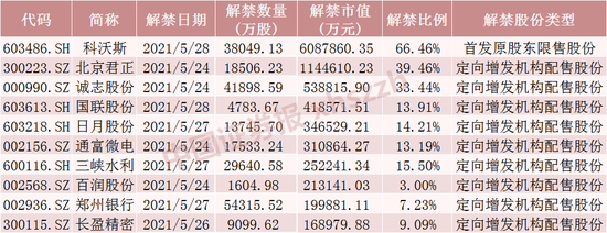 具体来看,科沃斯28日将解禁3.80亿股,均为首发原股东限售股份;北京君正和诚志股份24日将分别解禁1.85亿股和4.19亿股,均为定向增发机构配售股份。