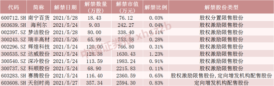 此外,上述46只个股中,南宁百货、海利尔、梦洁股份、瑞丰高材、辉煌科技解禁市值不足1000万元,其中南宁百货为股权分置限售股份解禁,其他个股为股权激励限售股份解禁。