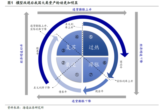 改进版的投资时钟。基于大的宏观背景做资产配置时,投资时钟是一个很好的工具。我们在今年3月底的报告《今年是弱版07年、强版10年——大类资产历史对比-20210326》中指出,传统的美林投资时钟虽然经典,但是尚有改进的空间。传统的美林时钟只考虑了经济增长和通胀两个维度四个象限,而我们认为,在资产配置的实践中,流动性影响也不可忽视,为此我们增加了名义利率(代表着货币政策,如加息或降息)和实际利率(名义利率-通胀)两个流动性指标,将原来的四象限配置模型改为了七象限配置模型,具体如下:
