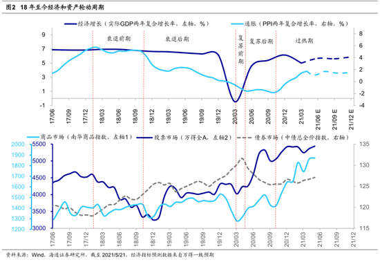 今年的投资时钟定位:过热期。如果单纯的看表观增速,今年GDP四个季度或逐季下降,PPI二季度或是全年高点,于是按照传统的投资时钟看,21Q1是过热期,Q2滞胀期,Q3衰退期。然而实际上宏观环境不可能一季度一大变,表观增速大幅波动只是因为同比数据会受到低基数的扰动。因此我们对今年宏观经济的判断还是要剔除掉基数的影响,即看两年年化增速。本轮投资时钟从2018年的2月开始,期间先后经历了衰退(18/02-20/03,标志是政策转向)和复苏(20/03-20/10,标志先是经济上行,后是PPI上行),去年10月至今(截止2021/5/21,下同)已经轮动到流动性边际收紧(社融、M2增速去年10月后开始向下)+基本面向上+通胀向上的过热期(阶段⑤)。展望今年,一季度GDP两年年化增速为5.0%,基于万得一致预期的GDP单季度两年年化增速在剩下三个季度分别为5.7%、5.6%和5.9%,全年GDP增速略向上;而PPI当月同比虽然在4月大幅抬升,但剔除去年低基数影响后的两年年化增速仅为1.7%,根据万得一致预期下半年PPI两年年化后的单月同比增速将基本维持在1.4%左右,通胀压力并不大。因此综合来看今年宏观环境依旧处在去年10月以来的过热期,股票市场还有机会。