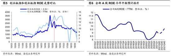 今年盈利扩张中,历史显示,指数与ROE更相关。前述我们从大类资产配置角度来论证了股票市场今年依旧有机会。回到股市本身来看,我们认为19年以来的牛市依旧没走完。回顾历史,过去三轮牛市高点均对应着业绩高点,具体而言:2005/06-2007/10牛市期间,上证指数和沪深300高点在07年10月,全部A股ROE高点在07Q4。2008/10-2010/11牛市期间,上证指数和沪深300在 09年8月达到高点,此后直到09年8月-10年11月持续高位震荡,中小板继续上行,高点在10年11月,ROE高点在10Q4。2012/12-2015/06牛市期间,创业板开始结构性牛市,创业板指盈利高点出现在15Q4,而由于清查配资等去杠杆因素,创业板指在15年6月出现高点,在业绩向好的催化下,15Q4创业板指反弹幅度显著。这次全部A股ROE从20Q2的7.9%见底Q3开始回升,21Q1A股ROE升至9.2%,目前只回升了3个季度,按照历史经验,A股盈利上行周期一般持续6-7个季度,按此推算,ROE有望回升至21年底22年初,以此推断今年指数大概率继续上涨,即延续19年初开启的牛市格局。我们预计全部A股21Q2-Q4三个季度对应的ROE(TTM)分别为8.8-9.0%、9.0-9.2%和9.5-9.7%,归母净利润同比增速的范围为18-24%,对应两年年化增速范围为12-15%。剔除金融后,全A增速范围为31-32%,两年年化增速约为18%。具体的测算详见《盈利在高位?不,低位——20年年报及21年一季报点评-20210501》。
